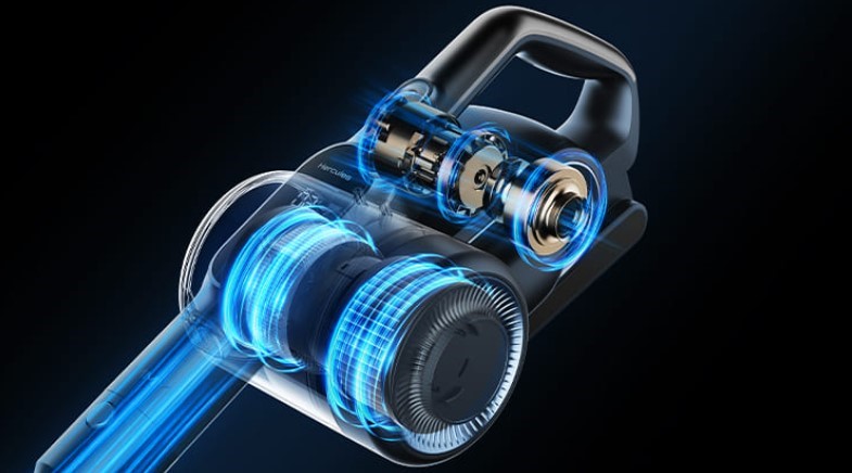 Фірмова система горизонтального циклону забезпечує прямий та рівний рух повітря всередині пилососа. Завдяки такій конструкції потік не сповільнюється, а сміття не накопичується в повітряних каналах, що дозволяє уникати засмічень під час прибирання. Це допомагає пилососу довше зберігати максимальну потужність, ефективно відфільтровувати пил і підтримувати стабільну продуктивність навіть при тривалій роботі.