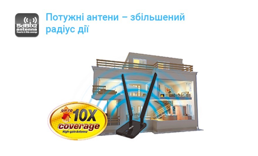 Антени з високим коефіцієнтом посилення сприяють розширенню радіусу дії мережі до 10 разів* у порівнянні з адаптерами стандарту Wi-Fi 802.11g. Знімна конструкція дозволяє при бажанні від'єднати антени або замінити їх при необхідності на ще більш потужні. *За даними тестування ASUS. Фактичні значення залежать від конфігурації мережі та умов навколишнього середовища.