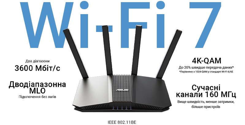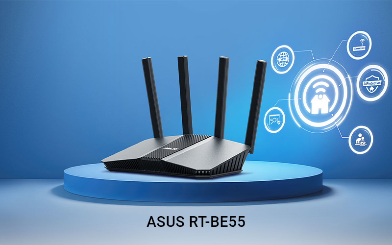 Дводіапазонний маршрутизатор RT-BE55 стандарту Wi-Fi 7 забезпечує блискавичну швидкість передачі даних до 3600 Мбіт/с, гарантуючи безперебійне відтворення потокового відео, онлайн-ігри без затримок і сумісність із наявними пристроями IoT.