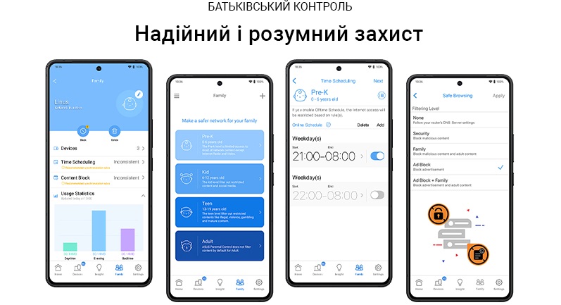 Попередньо встановлені профілі дозволяють автоматично фільтрувати неприйнятний вміст і встановлювати розклад доступу до мережі, що полегшує застосування налаштувань відповідно до віку дітей.