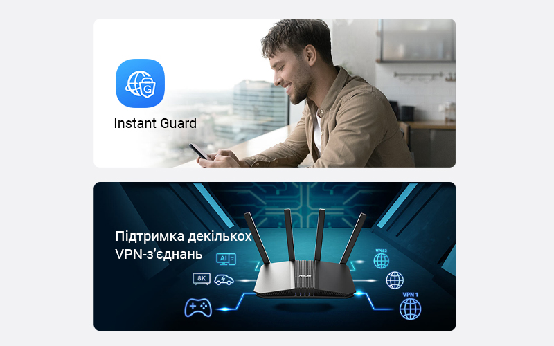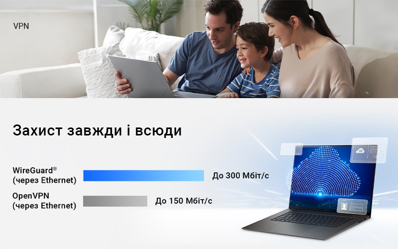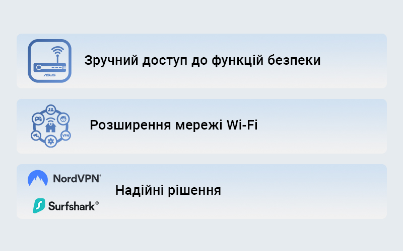 ASUS співпрацює з надійними постачальниками рішень безпеки та VPN, пропонуючи комплексні засоби захисту з оптимальною продуктивністю.