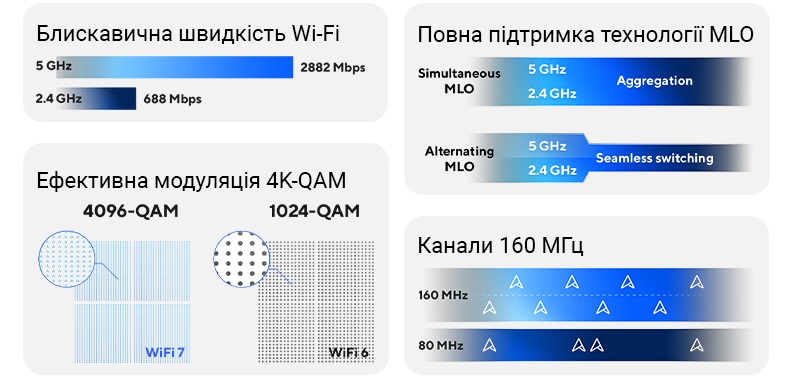 Порівняно з модуляцією 1024-QAM у стандарті Wi-Fi 6/6E, модуляція 4096-QAM дозволяє кожному сигналу об’єднувати більше даних, забезпечуючи на 20% вищу ефективність передачі даних*.