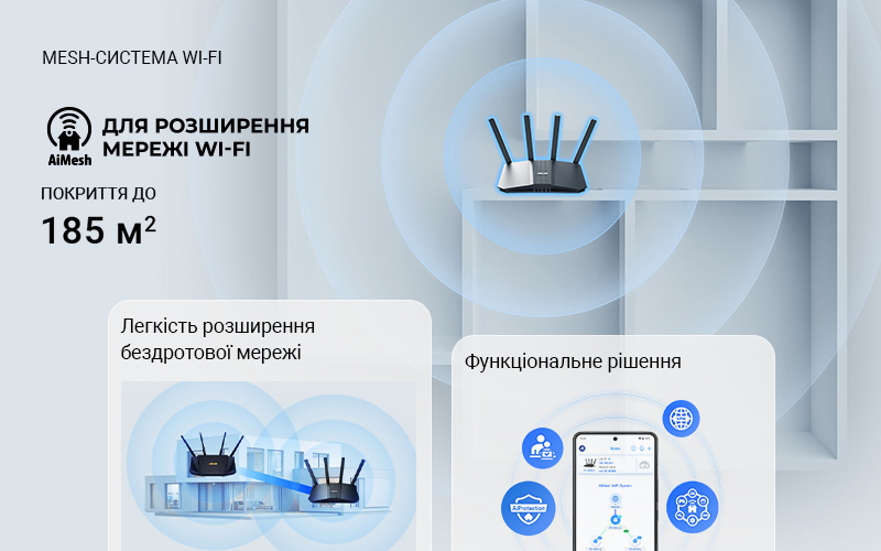 Технологія AiMesh не просто розширює зону покриття мережі й забезпечує плавний роумінг всередині неї. Вона працює з усіма сумісними маршрутизаторами ASUS, пропонуючи легкість керування, сучасний захист і функції розумного дому для всієї вашої мережі.