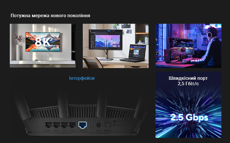 Завдяки сучасному процесору RT-BE55 володіє винятковою потужністю. Він розкриває потенціал сучасних функцій і чудово підходить для потокової передачі відео 8K, ігор з підтримкою HDR та застосунків з ШІ.