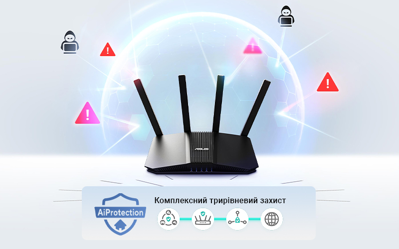 Маршрутизатор захищено за допомогою інтегрованих засобів безпеки, які автоматично оновлюються й виконують сканування для захисту пристроїв від шкідливого програмного забезпечення та нових загроз.