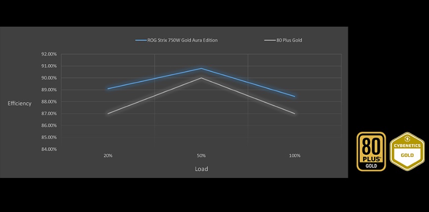 Високоякісні японські конденсатори забезпечують ефективну роботу та допомогли блокам живлення ROG Strix Aura Edition отримати сертифікат 80 PLUS Gold. Підвищена ефективність також призводить до меншого нагрівання, зменшення шуму та підвищення надійності.