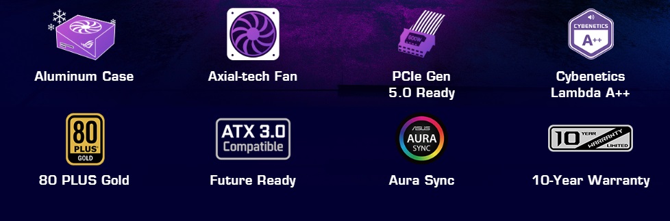 ROG Strix 750W Gold Aura поєднує в собі преміальні компоненти, чудову систему охолодження та захоплююче RGB-підсвічування, створюючи вражаючу потужність. Завдяки величезним радіаторам ROG, високоефективному вентилятору Axial-tech та вражаючим алюмінієвим покриттям, це потужний блок живлення для вашої наступної ігрової системи.