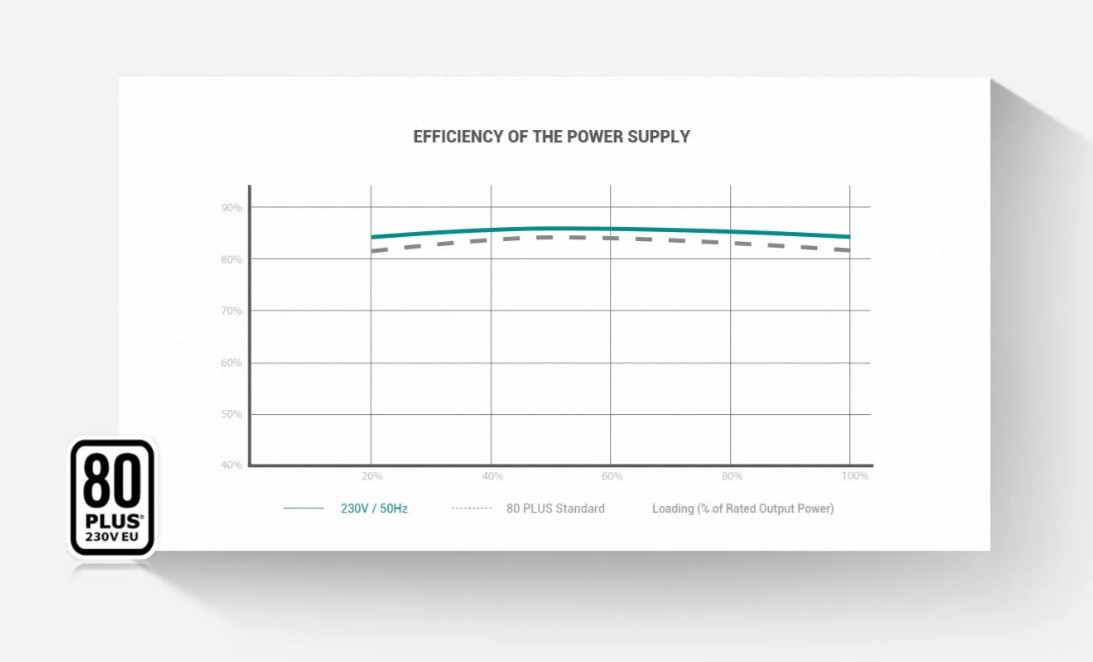 Модель відповідає вимогам сертифікації 80 PLUS 230V EU. При навантаженні 50% блок працює із ефективністю 85%.