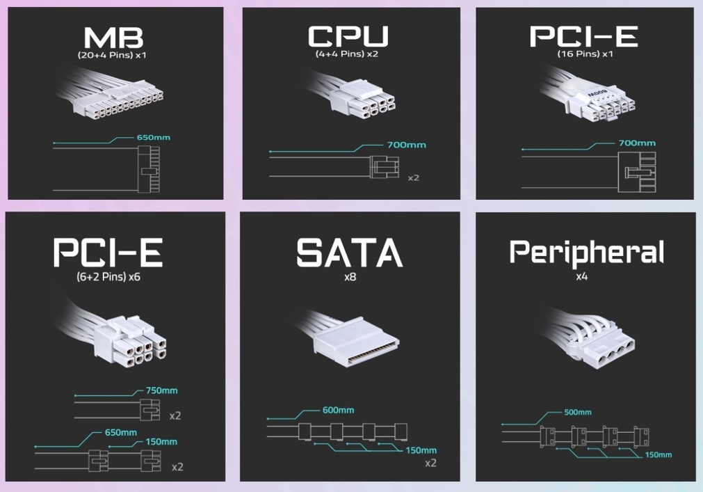 | Довжина кабеля: | MB (20+4) pin - 650 мм; CPU (4+4) pin - 2 х 700 мм; PCIE (6+2) pin - 2 х 650 + 150 мм + 2 х 750 мм; SATA - 8 х 600 + 150 + 150 + 150 мм; Molex - 500 + 150 + 150 + 150 мм |