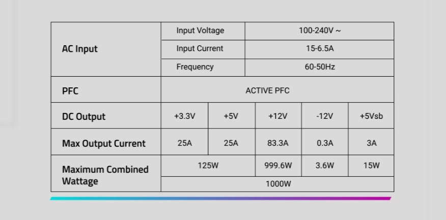 AE1000PM PG5 ICE може витримувати коливання потужності до 3 разів порівняно з потужністю графічного процесора та в 2 рази порівняно з загальною потужністю. Він повністю сумісний зі стандартом Intel ATX 3.0, підтримуючи коливання потужності до 200% та досягаючи ефективності 70% при низьких навантаженнях. Крім того, високоякісний 16-контактний кабель, що входить до комплекта, забезпечує сумісність з відеокартами PCIe Gen 5.0, забезпечуючи потужність до 600 Вт.