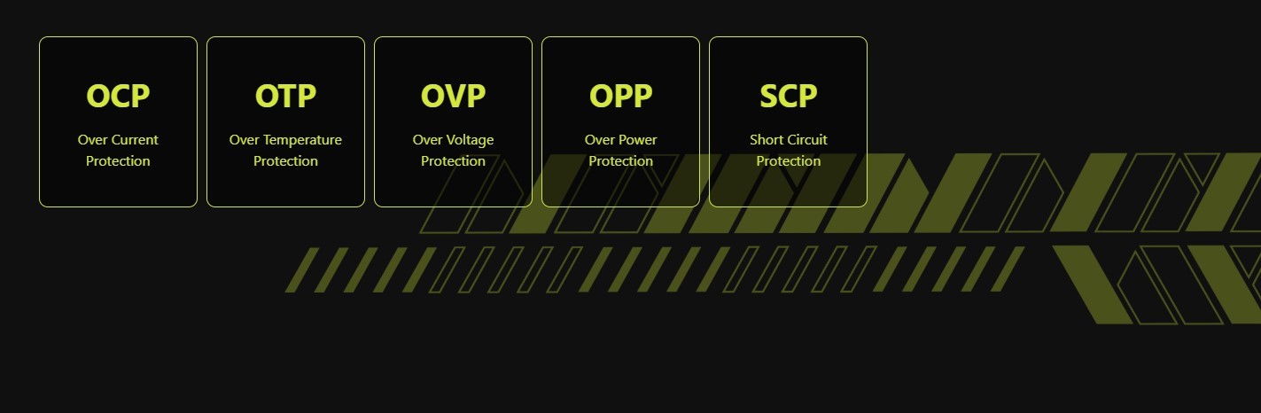 MSI MAG A750GN PCIE5 750W має комплекс захистів: від перевантаження (OPP), перенапруги (OVP), зниженої напруги (UVP), короткого замикання (SCP), перевищення струму (OCP) та перегрівання (OTP). Це забезпечує надійну роботу системи за будь-яких умов.