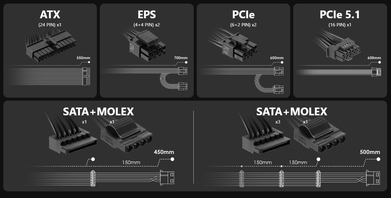 Вбудований 16-контактний роз’єм PCIe розрахований на навантаження до 450 Вт, що відповідає стандарту PCIe CEM 5.1. Це рішення робить блок живлення ідеальним вибором для серії NVIDIA GeForce RTX 40, де особливо важлива стабільність і безпека подачі енергії під час інтенсивних навантажень. Завдяки цьому усувається необхідність у використанні додаткових адаптерів, а система отримує ефективніше та надійніше живлення.