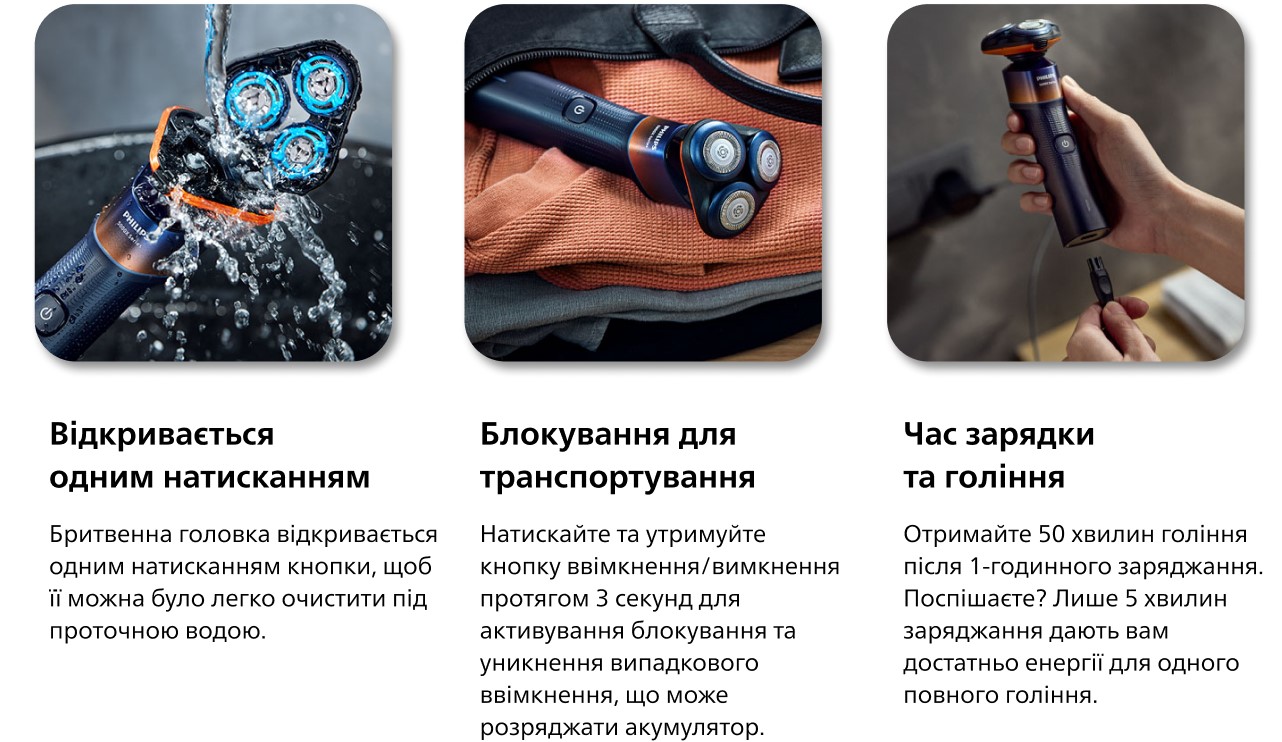 Бритвенні головки обертаються на 360°, щоб забезпечити оптимальний контакт зі шкірою.