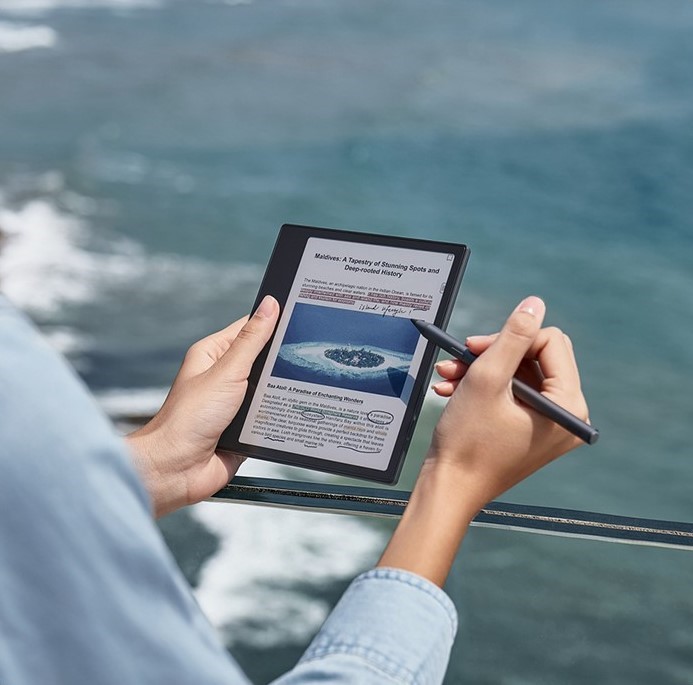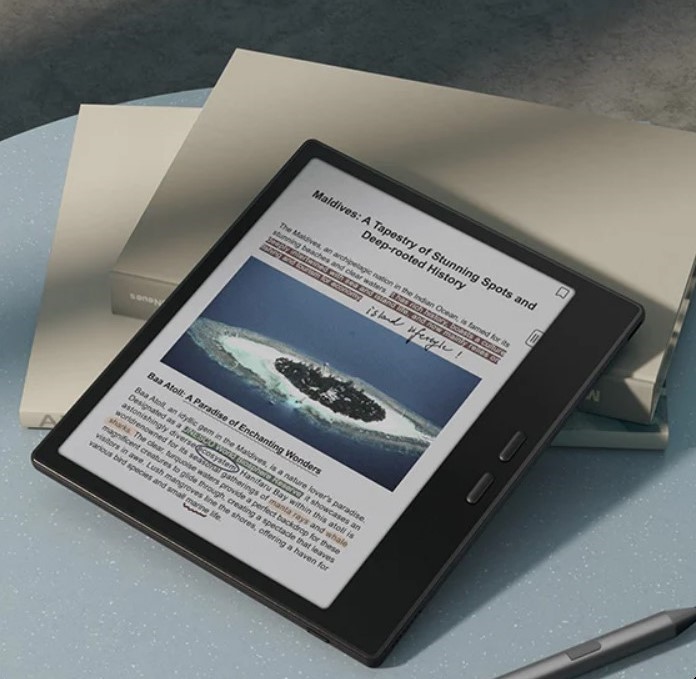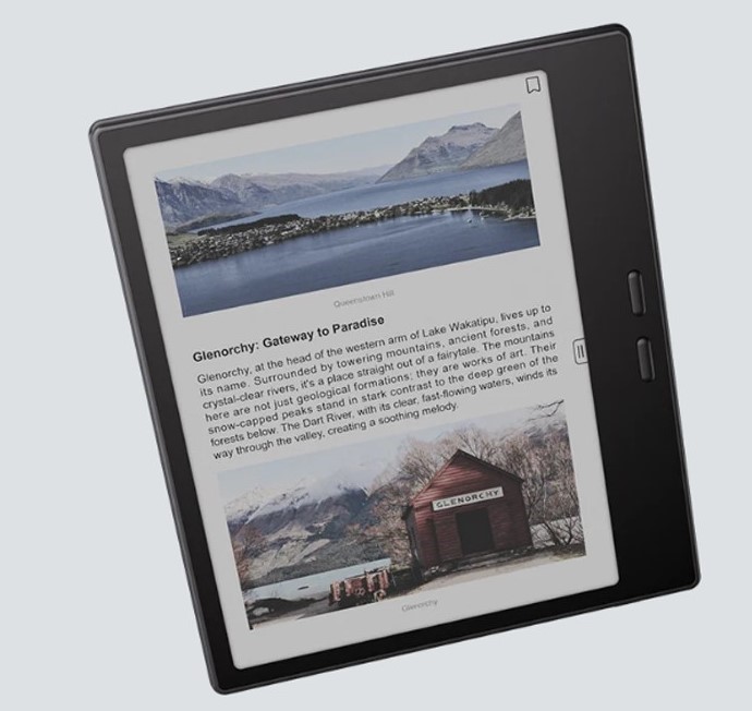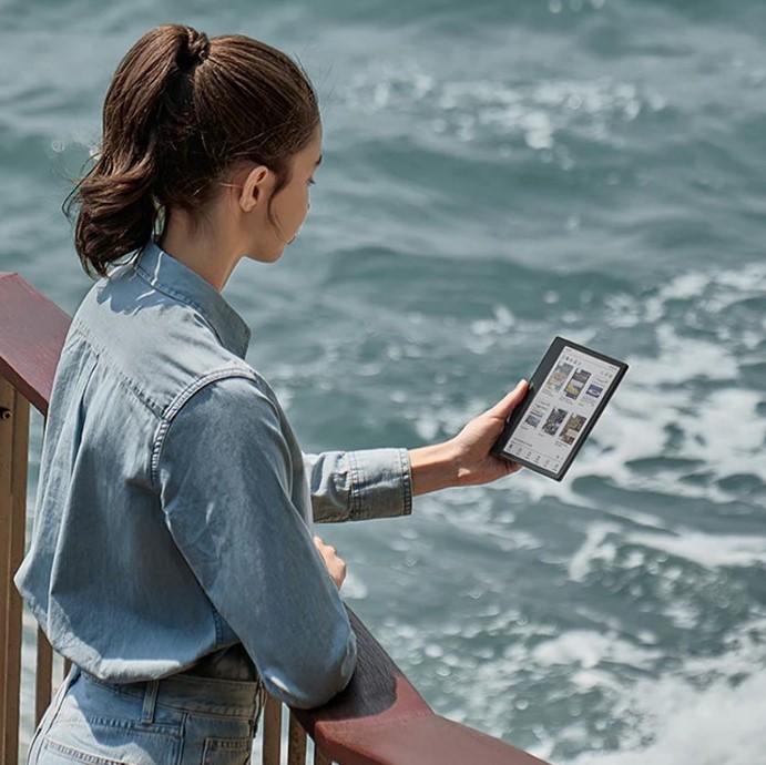 Екран на третину більший, ніж у класичних 6-дюймових рідерів, що робить текст і графіку більш комфортними для сприйняття. Вбудований G-сенсор автоматично адаптує орієнтацію дисплея, а кнопки перегортання підлаштовуються під положення пристрою.