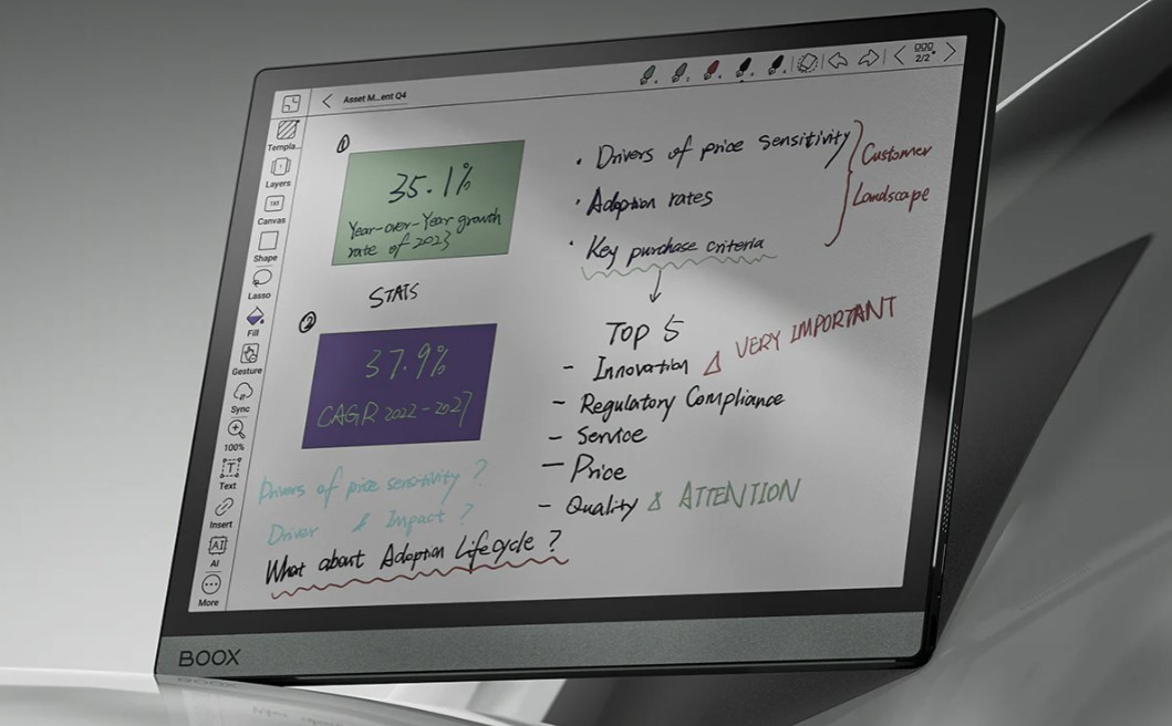Вбудований графічний процесор у поєднанні з технологією Boox Super Refresh значно прискорює відтворення сторінок і переміщення об’єктів на дисплеї. Це особливо корисно для перегляду кольорових документів, презентацій та PDF-файлів із великою кількістю зображень.
