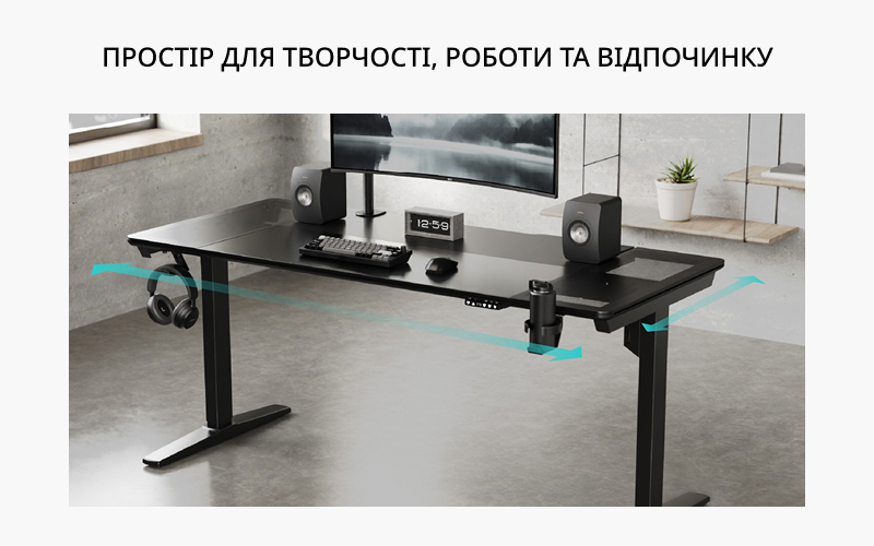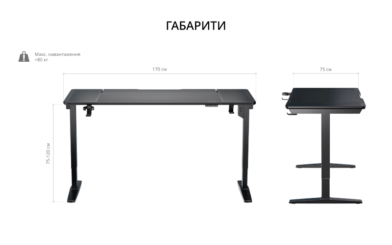 Велика робоча поверхня розміром 170×75 см забезпечує достатньо місця для моніторів, документів, аксесуарів та творчих проєктів. Простора стільниця дозволяє зручно розмістити всі необхідні пристрої та інструменти, створюючи організоване, функціональне та комфортне робоче середовище без зайвого безладу.