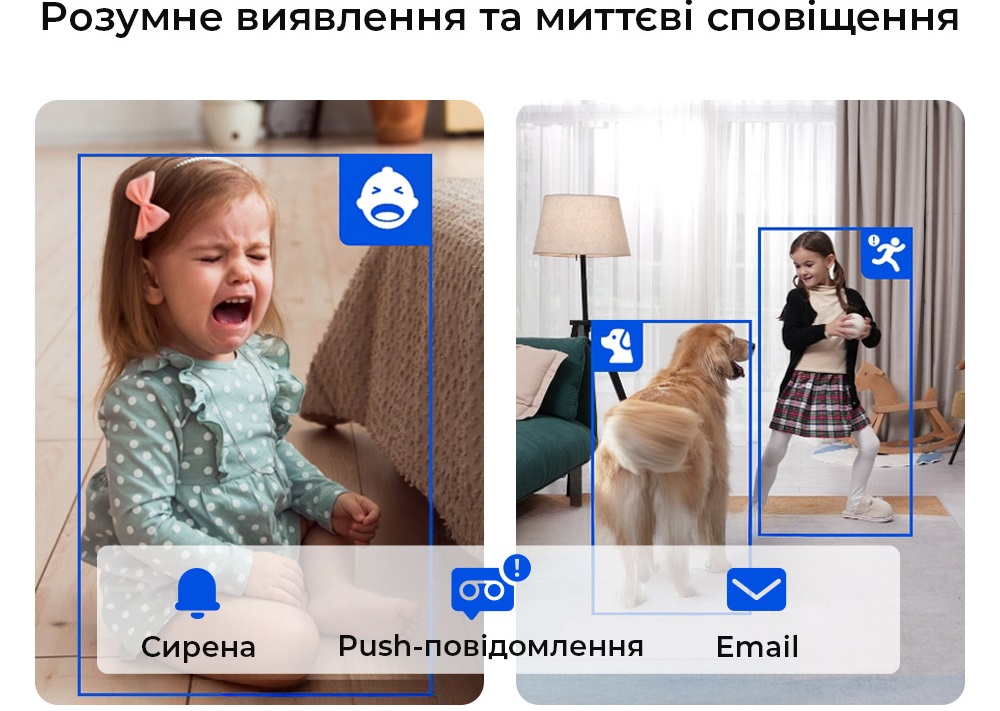 Камера не просто бачить рух — вона розпізнає людей, домашніх тварин і навіть плач дитини! Отримуйте миттєві сповіщення (Push-повідомлення, Email, Сирена) лише про дійсно важливі події.