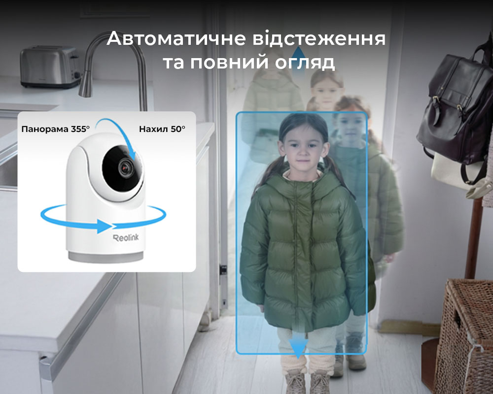 Камера автоматично відстежує та фокусується на людях або тваринах, що рухаються. Завдяки повороту 355° та нахилу 50° вона завжди тримає об'єкт у полі зору, покриваючи весь простір.