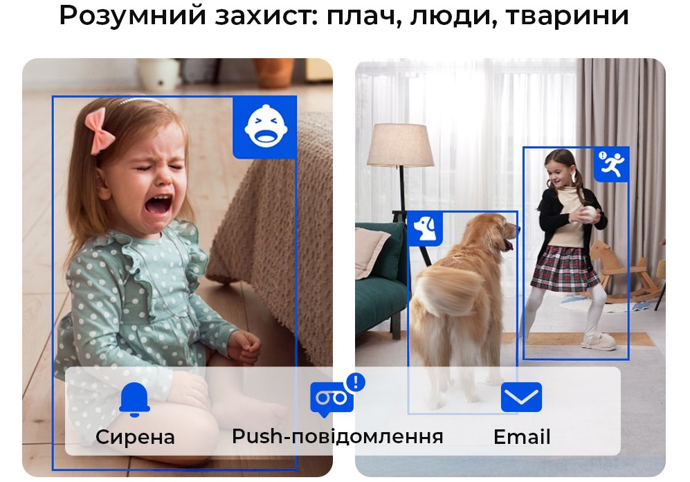 Камера E331 здатна відрізняти рух людей та домашніх тварин, а також розпізнавати плач дитини. Отримуйте Push-сповіщення, Email або вмикайте Сирену лише тоді, коли це справді важливо.