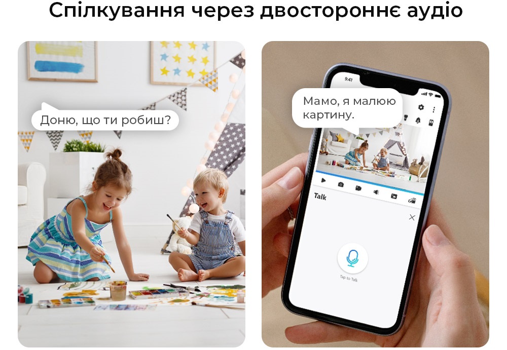 Завдяки вбудованому мікрофону та динаміку ви можете чути, що відбувається, і розмовляти в реальному часі. Пограйтеся з домашнім улюбленцем або заспокойте дитину на відстані.