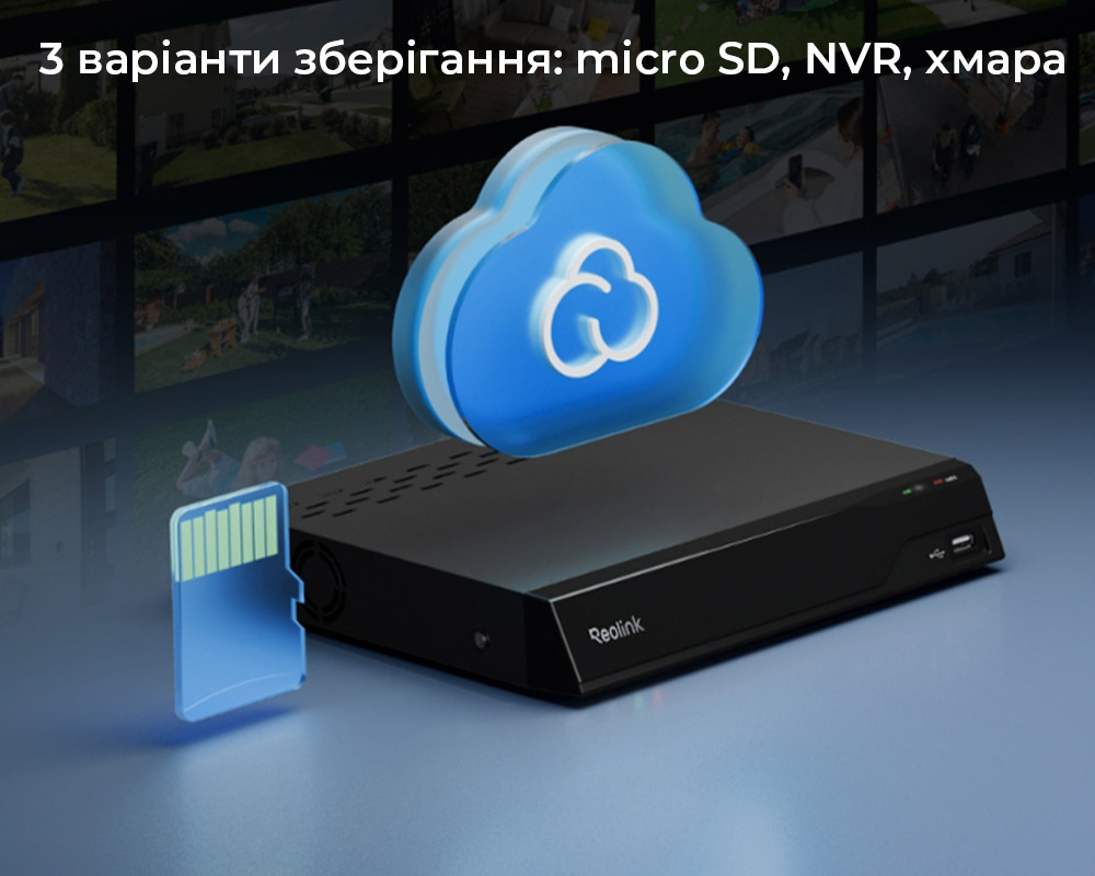 Гнучке зберігання відеозаписів. Зберігайте на microSD-картці (до 512 ГБ), на спеціалізованому відеореєстраторі Reolink NVR або в безпечному хмарному сховищі Reolink Cloud.