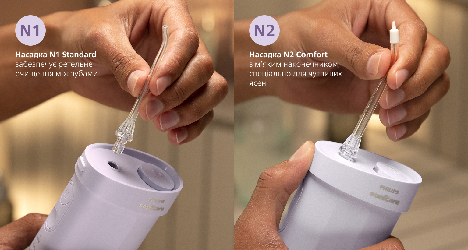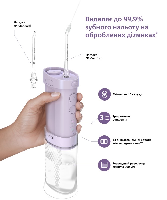Іригатор має дві насадки, що дозволяють видаляти до 99,9%* нальоту на оброблених ділянках. Обидві насадки обертаються на 360°, що дозволяє легко очищати важкодоступні ділянки, зокрема зону жувальних зубів.