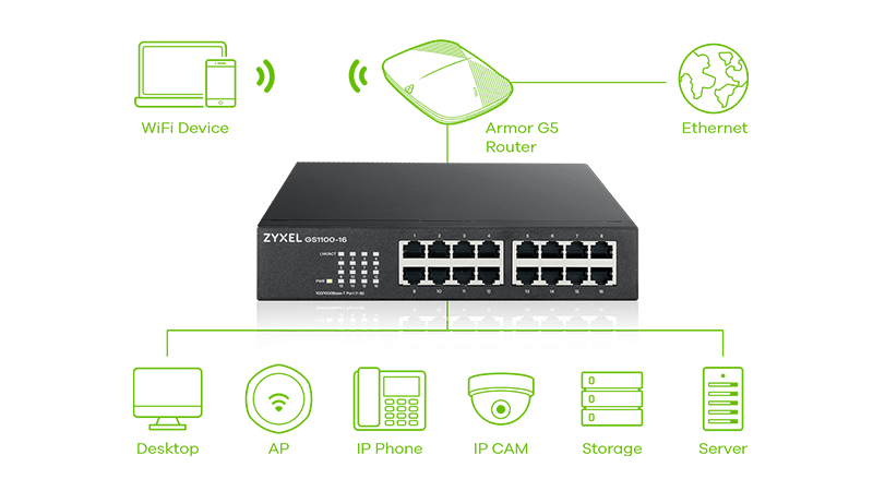 Серія комутаторів GS1100 пропонує різноманітні варіанти для різних офісних потреб: доступні моделі на 8, 16 або 24 порти. Виберіть той, що ідеально підходить для розміру та потреб вашої мережі.