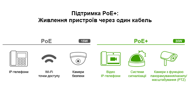 Модель GS1100-10HP підтримує стандарт PoE+ (IEEE 802.3at), який забезпечує до 30 Вт потужності на порт. Це дозволяє автоматично живити сумісні IP-телефони, камери відеоспостереження або бездротові точки доступу без потреби в окремих блоках живлення.