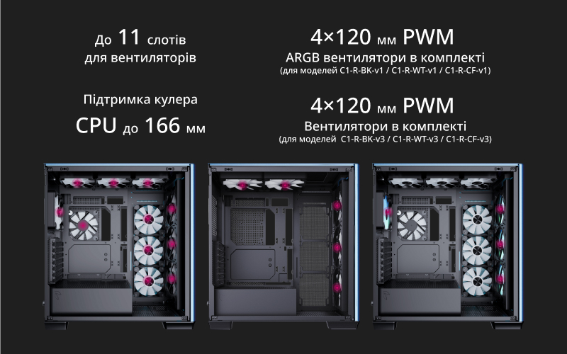 - 4×120 мм PWM ARGB вентилятори в комплекті (для моделей C1-R-BK-v1 / C1-R-WT-v1 / C1-R-CF-v1)