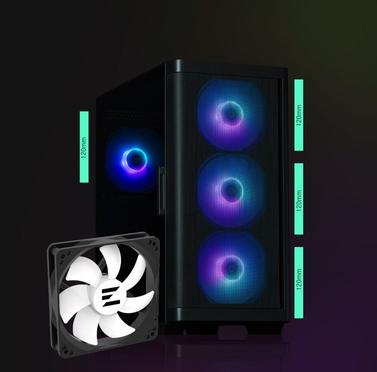 Корпус оснащений чотирма попередньо встановленими ARGB-вентиляторами: три спереду та один позаду. Вони забезпечують інтенсивний рух повітря, швидке розсіювання тепла і водночас створюють стильний візуальний ефект завдяки підсвічуванню.