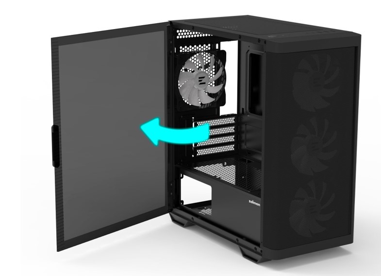 Бічна панель із загартованого скла має відкидну конструкцію, що значно спрощує доступ до внутрішнього простору корпусу. Це зручно як для швидкої заміни комплектуючих, так і для обслуговування системи.