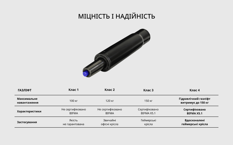 Завдяки шести варіантам регулювання ви легко зможете налаштувати крісло під свої потреби та знайти максимально комфортне положення для роботи, відпочинку чи гри. Повністю регульована спинка дозволяє відкинутися назад, щоб відпочити або змінити положення під час роботи чи гри. Налаштуйте висоту сидіння за допомогою зручного важеля. Газліфт 4 класу забезпечує плавне та надійне регулювання.