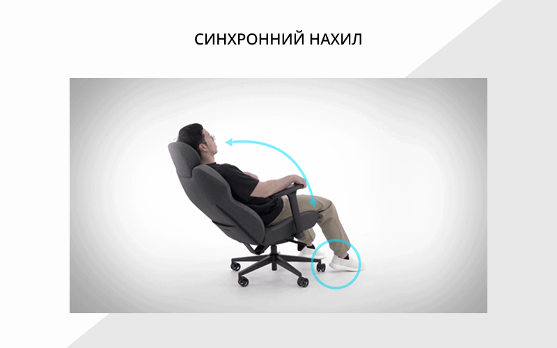 Відкиньтеся назад і розслабтеся. Синхронний механізм нахилу дозволяє спинці та сидінню рухатися разом в оптимальному співвідношенні, підтримуючи природне положення тіла та забезпечуючи комфорт під час роботи або гри.