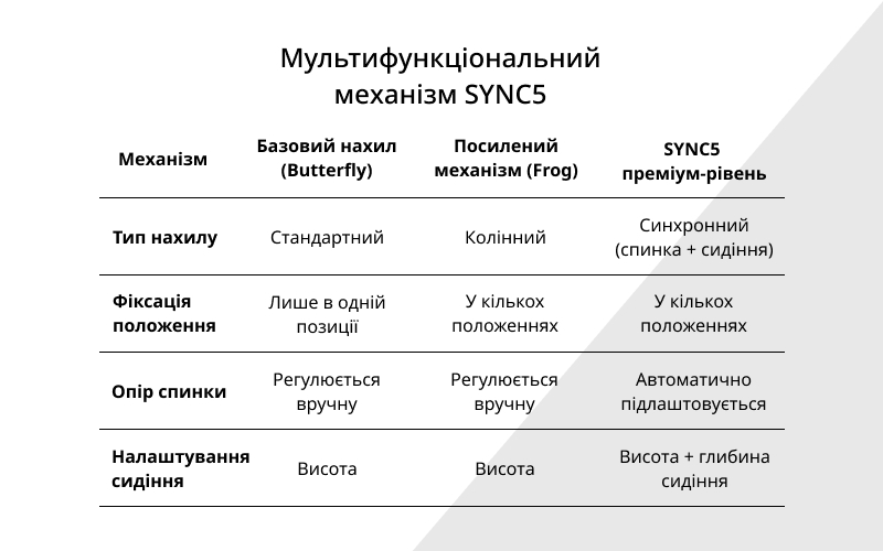 Мультифункціональний механізм SYNC5. 5 рівнів налаштування для вашого комфорту