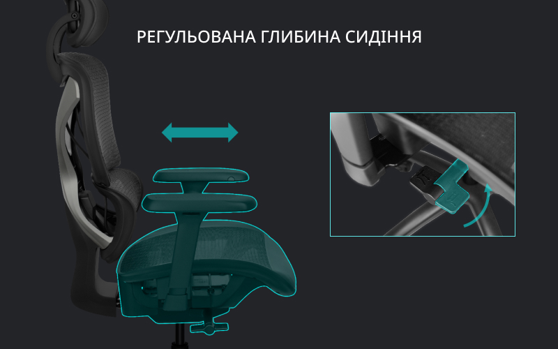 Налаштуйте глибину сидіння під власні уподобання. Відкидайтеся назад чи сидіть рівно, зберігаючи ідеальний баланс між комфортом і підтримкою хребта.