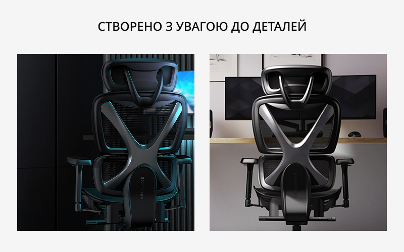 Наш дизайн вирізняється міцною Х-подібною конструкцією, що поєднує подвійний ефект: надійну рівномірну підтримку для будь-якого типу тіла та елегантний, преміальний вигляд Вашого крісла.