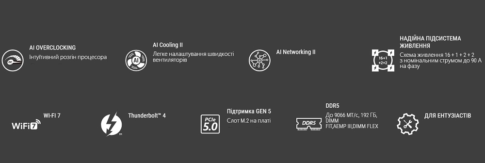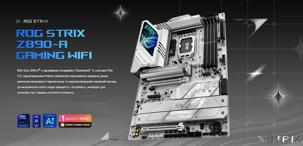 Завдяки Thunderbolt 4, PCIe 5.0 і підсвічуванню Polymo, ROG Strix Z890-A забезпечує блискавичну передачу даних, виняткові можливості під’єднання і настроювану естетику, яка може бути тонкою або сміливою. Ця материнська плата забезпечує потужність і швидкість, необхідні для елітних ігор і вимог передових додатків для ПК зі штучним інтелектом.