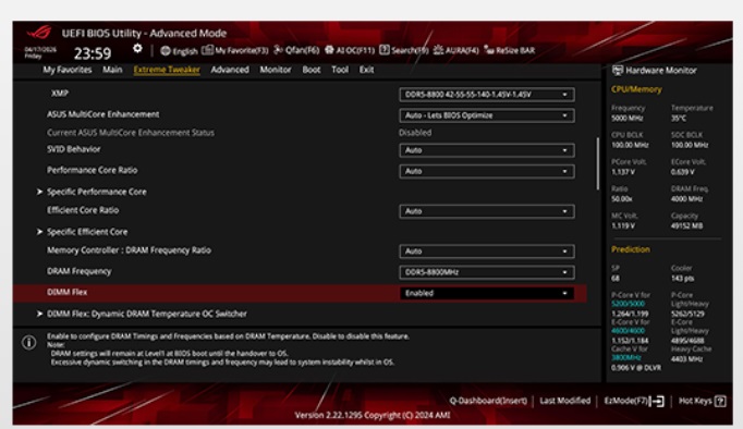 DIMM Flex надає ентузіастам новий потужний спосіб розгону модулів пам’яті DDR5. У ньому використовується спеціалізована схема, яка може підвищити продуктивність або усунути потенційні проблеми зі стабільністю залежно від показань температури. За номінальних температур він може використовувати додатковий простір для збільшення швидкості та ефективності. А коли температура підвищується, він може скоригувати поведінку пам’яті в бік зменшення, щоб зберегти стабільність.