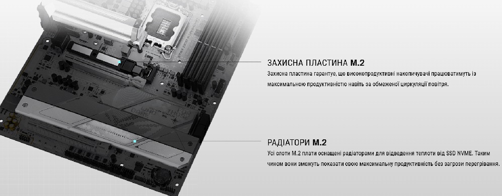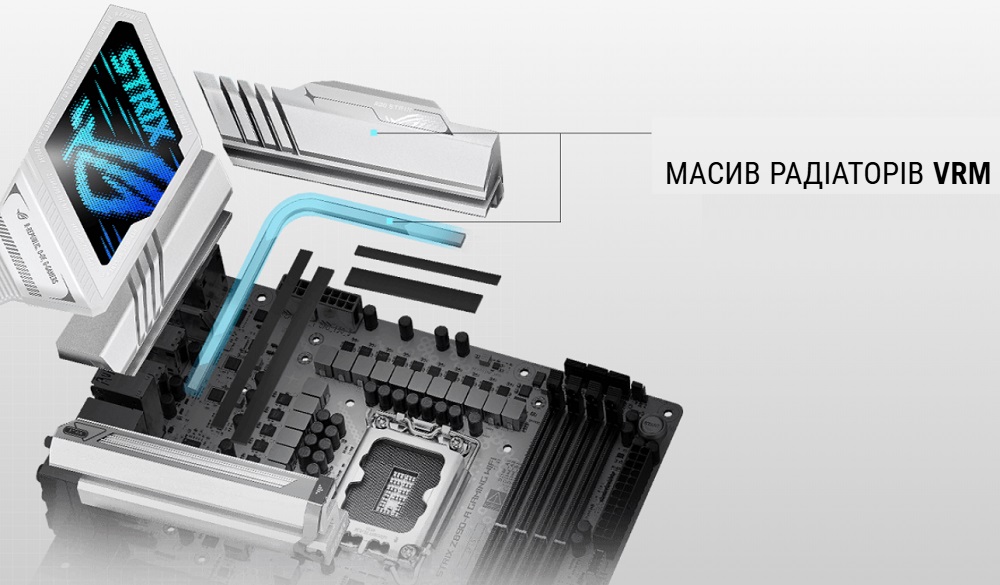 Два товсті радіатори, що покривають секцію подавання живлення, забезпечують стратегічні канали повітряного потоку для посиленого відведення тепла під час роботи з високопродуктивними процесорами Intel Core Ultra (серія 2).