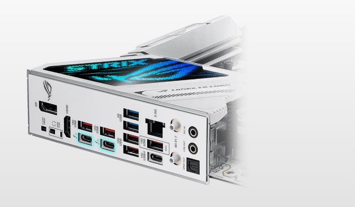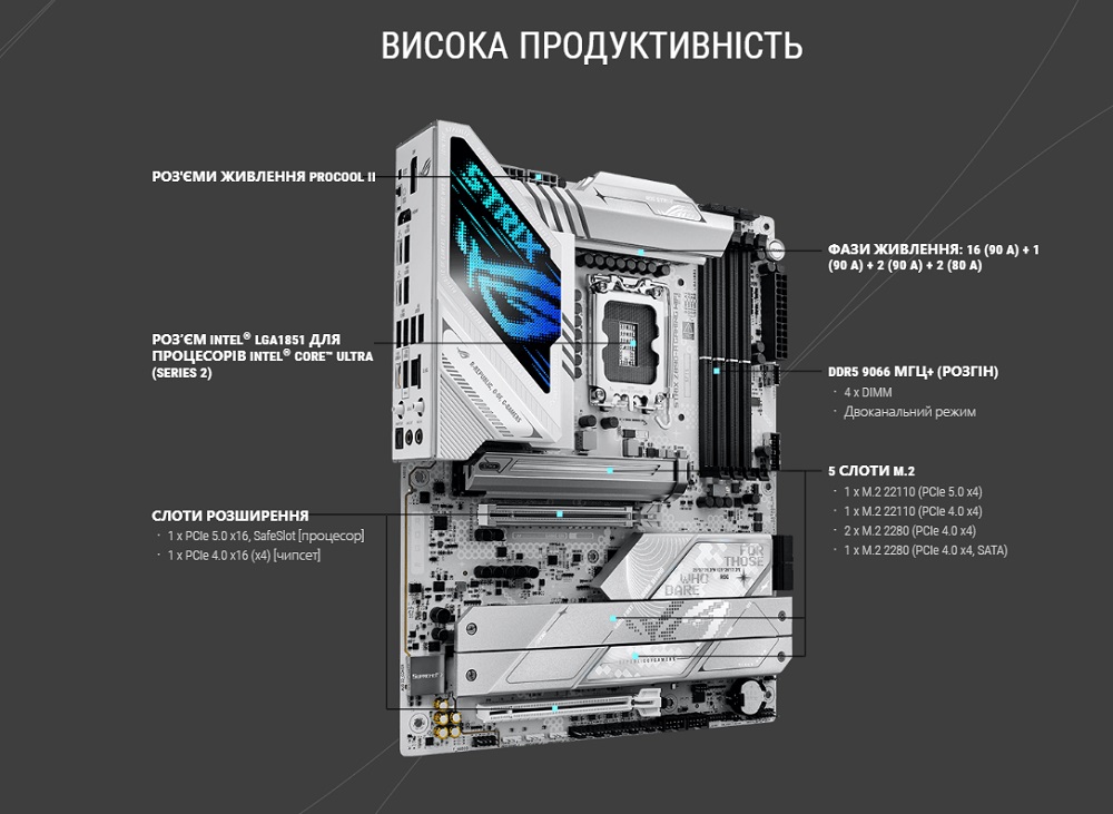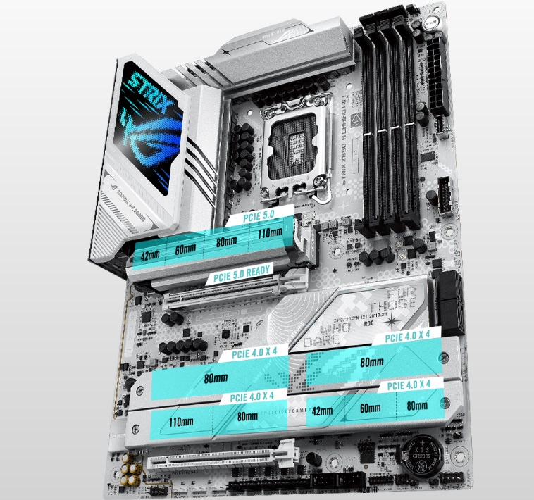 ROG Strix Z890-A пропонує наскрізну підтримку PCIe 5.0, а самий верхній слот розширення x16 захищений утримуючим кронштейном SafeSlot, який витримає вагу новітніх відеокарт. Один із вбудованих слотів M.2 розрахований на вражаючі швидкості читання і запису до 16 ГБ/с, а інші можуть забезпечити передачу даних зі швидкістю 8 ГБ/с. Кожен слот M.2 оснащений потужними радіаторами для відведення тепла від накопичувачів нового покоління.