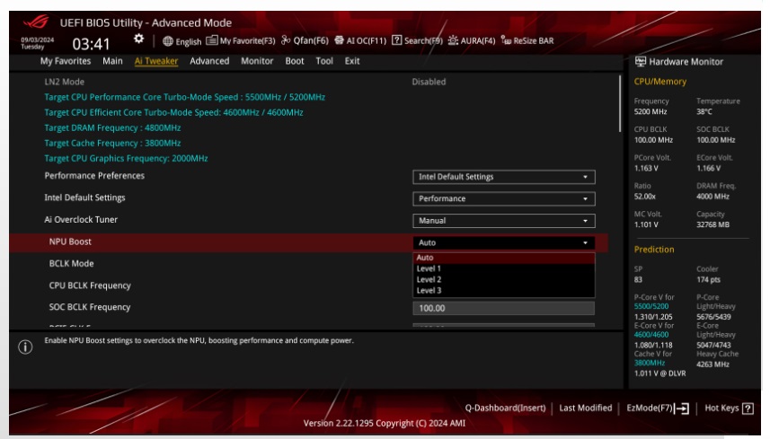 Інтегрований NPU в процесорах Intel Core Ultra (серія 2) ефективно прискорює робочі процеси штучного інтелекту, а NPU Boost дає змогу зробити з його допомогою ще більше. Ця функція BIOS розганяє NPU одним клацанням миші, збільшуючи продуктивність до 24%.