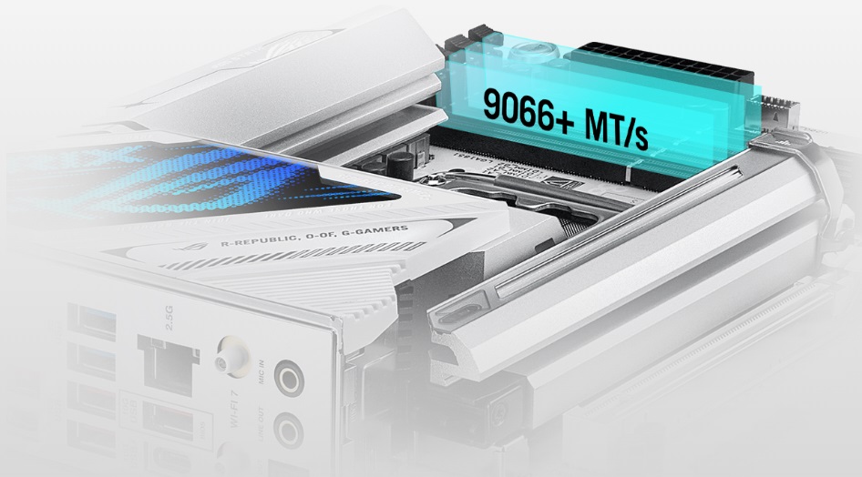 Завдяки оптимізованому розведенню доріжок, що з’єднують слоти пам'яті на платі ROG Strix Z890-A, найкращі комплекти пам’яті здатні працювати зі швидкодією понад 9 ГТ/с.
