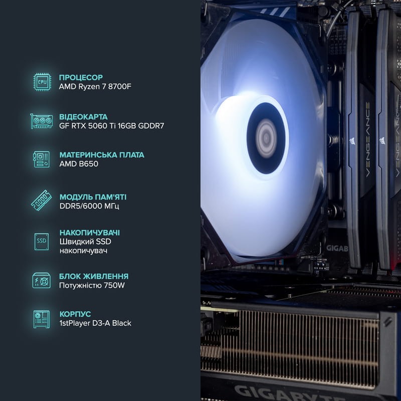 Доброго дня. На сьогодні встановлюються наступні комплектуючі: Материнська плата Gigabyte B650M Gaming Plus WiFi Socket AM5 Відеокарта GF RTX 5060 Ti 16GB GDDR7 Eagle Max OC Gigabyte (GV-N506TEAGLEMAX OC-16GD) Блок живлення 1stPlayer HA-750AC2 (ACK-STD-750-BK-EU) 750W Корпус 1stPlayer D3-A-BK-1F7-14-1F7 Black без блока живлення Процесор AMD Ryzen 7 8700F (4.1GHz 16MB 65W AM5) Tray (100-000001590) Модуль пам’яті DDR5 2x16GB/6000 Kingston Fury Beast Black (KF560C36BBE2K2-32) Накопичувач SSD 1TB M.2 NVMe Kingston NV3 M.2 2280 PCIe Gen4.0 x4 (SNV3S/1000G) Кулер процесорний ID-Cooling SE-224-XTS ARGB Black