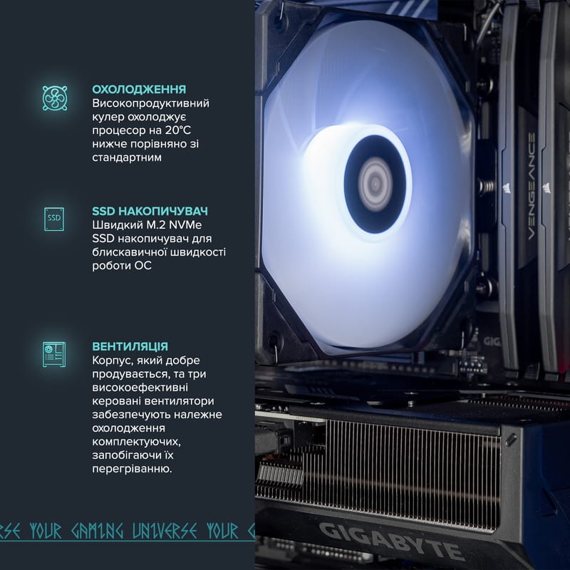 Високопродуктивний кулер знижує температуру процесора на 30°C порівняно зі стандартними рішеннями, що забезпечує стабільну роботу навіть під час найвищих навантажень. Швидкий М.2 NVMe SSD накопичувач гарантує блискавичну швидкість роботи операційної системи та додатків, що значно скорочує часи завантаження та підвищує загальну продуктивність системи. Завдяки добре продуваному корпусу та трьом високоефективним керованим вентиляторам, всі компоненти залишаються охолодженими, запобігаючи перегріву та забезпечуючи довготривалу стабільну роботу ПК навіть під час найінтенсивніших ігрових сесій чи ресурсомістких завдань.