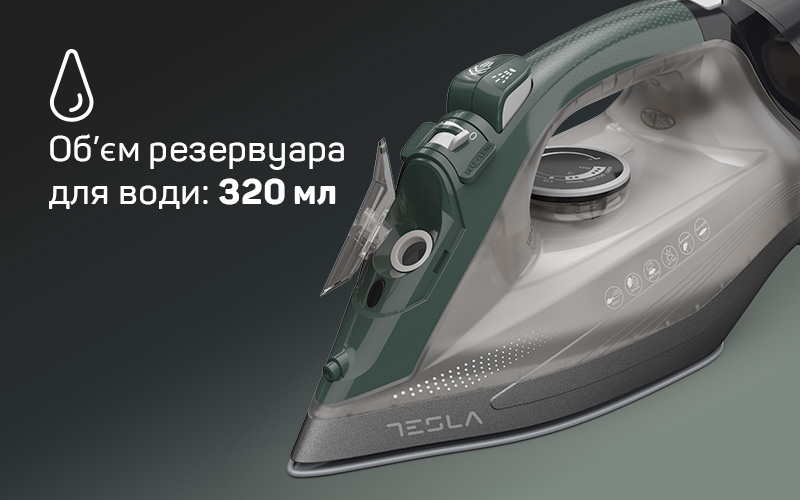 Резервуар об’ємом 320 мл забезпечує достатню кількість води для тривалого прасування без необхідності частого доливання води. Такий обсяг робить процес прасування більш зручним і ефективним, особливо при роботі з великим обсягом білизни.