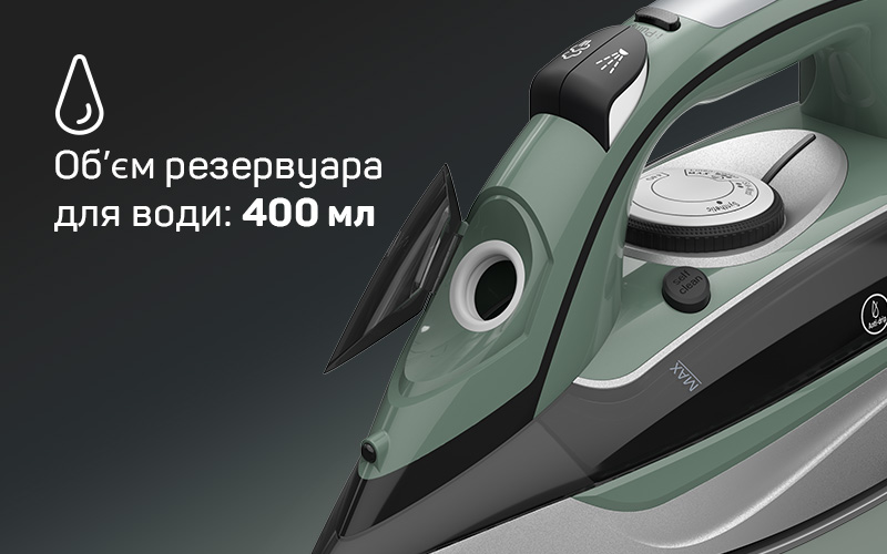 Збільшений резервуар для води об’ємом 400 мл дозволяє прасувати довше без необхідності частого доливання води. Така ємність також ідеально підходить для генерації пари при прасуванні великої кількості білизни. Обирайте більший резервуар — для зручності та економії часу.
