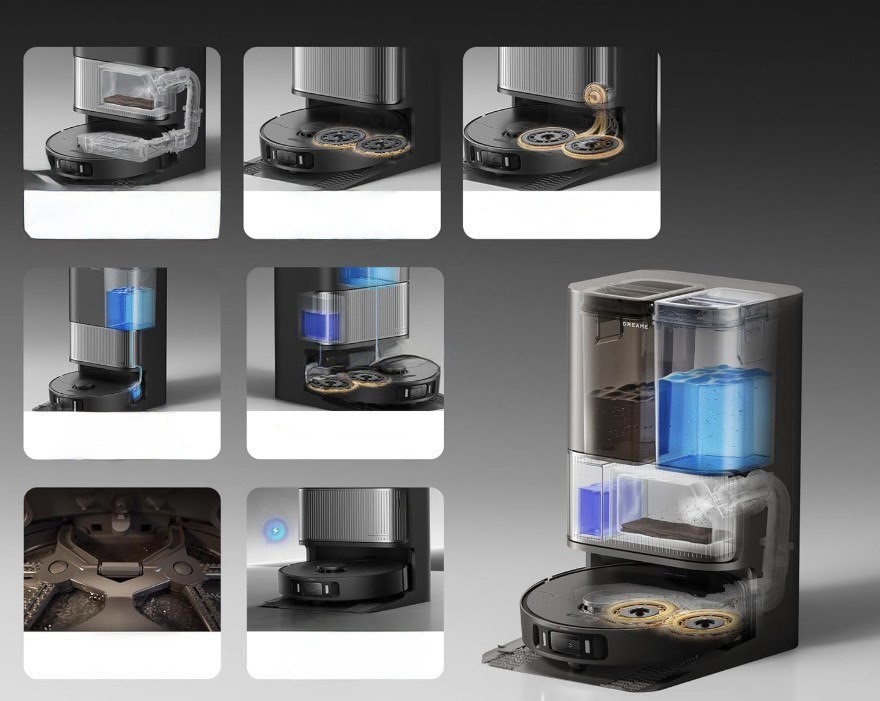 RGB-камера і сенсори станції визначають забруднення підлоги та стан використаної води. При необхідності робот повторно промиває насадку та підлогу, досягаючи ідеальної чистоти навіть після складних плям.