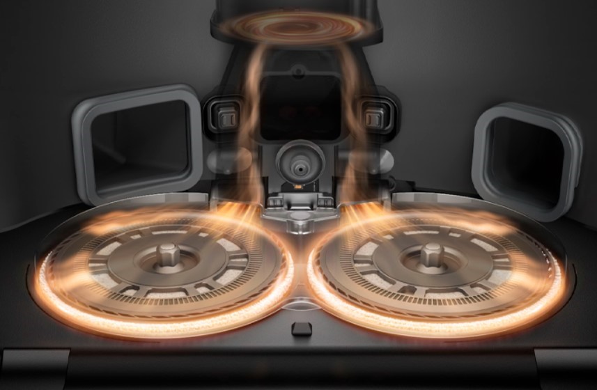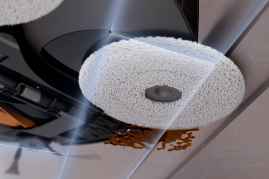 У моделі X50 Master піднімається не лише мийна платформа, а й основна та бічна щітка. Це дозволяє виконувати сухе та вологе прибирання окремо, не змішуючи процеси. Робот спочатку підмітає все сміття, а потім переходить до миття. Якщо він виявляє вологі ділянки, система автоматично активує режим промивання: мопи поглинають рідину, а не розмазують її — підлога залишається чистою та майже сухою.