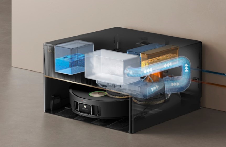 Станція Dreame X50 Master займає мінімум місця завдяки висоті всього 24,9 см, що дозволяє розміщувати її під тумбами або поруч зі стіною без зайвого візуального навантаження. Попри компактні розміри, вона виконує всі важливі завдання: автоматично очищає мопи та мікрофібру, сушить їх теплим повітрям, підливає чисту воду та заряджає робот. Такий підхід робить обслуговування максимально простим і повністю автономним.