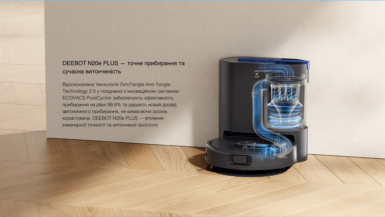 Відкрийте новий рівень чистоти з DEEBOT N20e Plus — роботом-пилососом, створеним для бездоганного прибирання. ZeroTangle 2.0 не дає щіткам намотувати волосся або шерсть, а надпотужне всмоктування 10000 Па ефективно очищує навіть глибокі шари килимів. DEEBOT N20e Plus — це поєднання інтелектуальних рішень, високої продуктивності та зручності, яке перетворює щоденне прибирання на просту та приємну справу.
